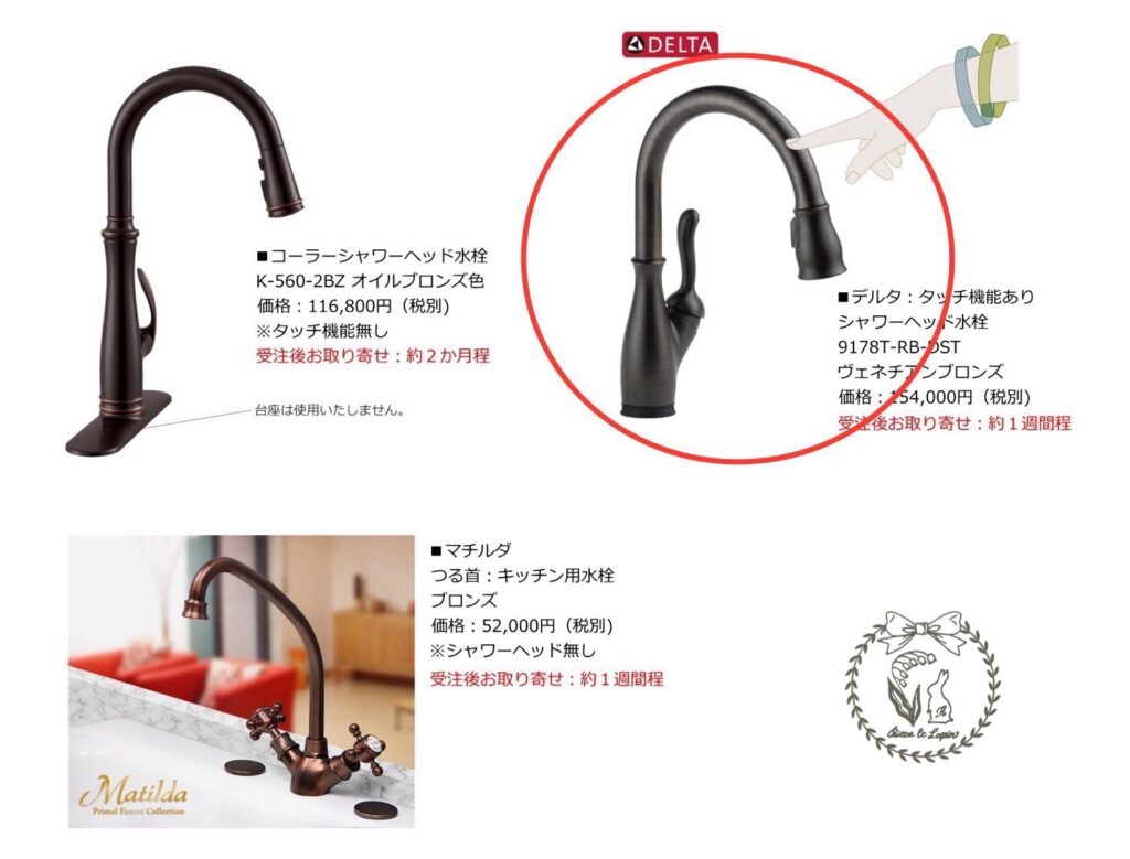 1番左下の物がデザイン的には可愛いけれど、実用性を考えるなら、右上のデルタの水栓を勧められました。海外製品でアフターサービスが必要になった際に、デルタが1番対応が良いとのことでした。デルタの水栓はタッチ機能が付いているので、デザインは可愛いけれどお値段は全く可愛くありません( ̄◇ ̄;) それに、タッチ機能なんて求めていなかったし…でも、アフターサービスってとても大切だし…という事で、赤丸のついているデルタの水栓にすることにしました。