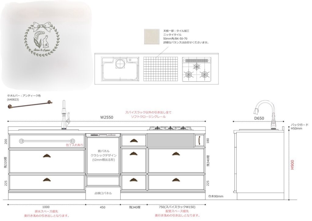 ちょうどシンクの前面にタオルバーを付けてもらいました。そして、タオルバーの部分に赤字で『包丁入れ有り』と加えられています。