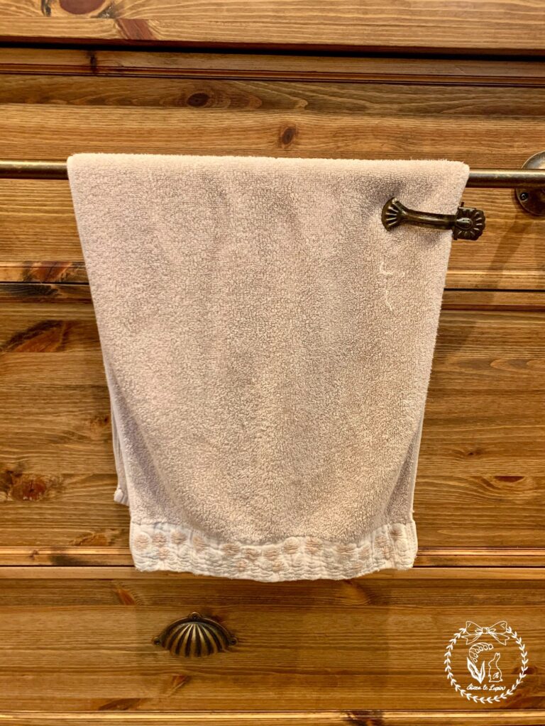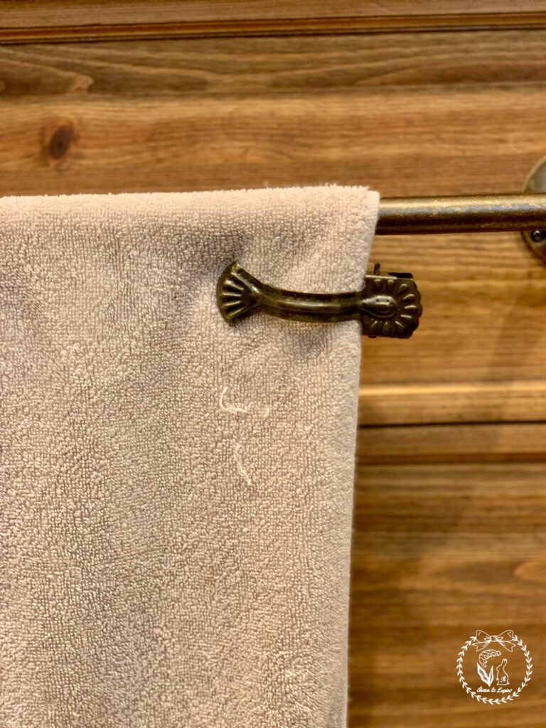 ちなみに、そのままタオルバーにかけるとずり落ちて床に墜落する事が頻発したので、セリアのカーテンタッセルで留めています٩( ‘ω’ )و