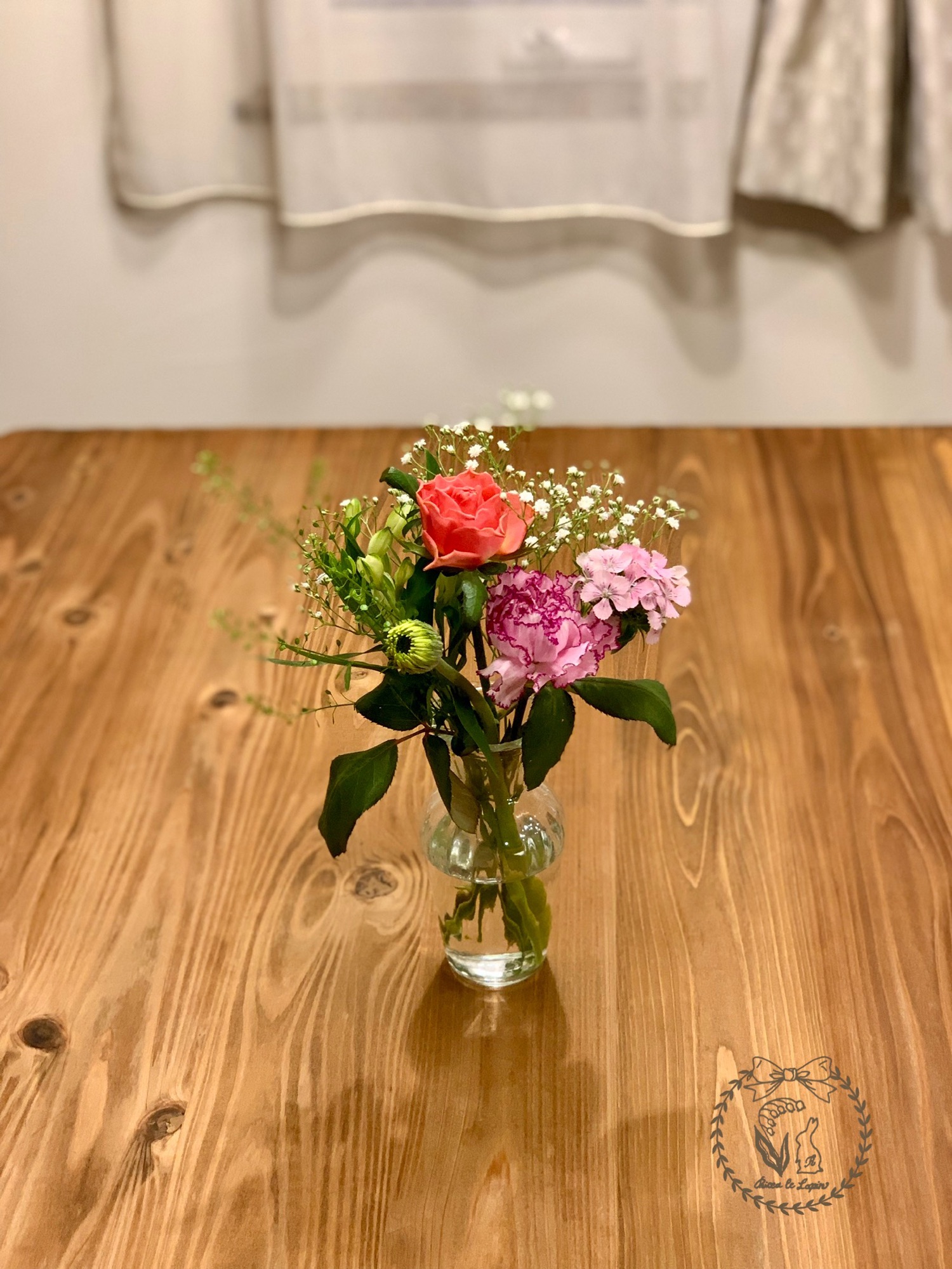 いい加減、息子がくれたお花の話に軌道修正しましょう。いけばなではなくバースデーブーケだったので、久しぶりに花瓶に花を飾りました。