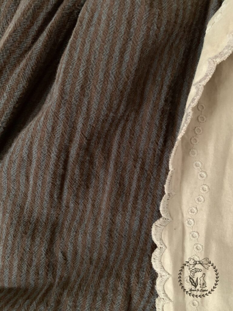 今日は、アイボリーのブラウスと合わせてみました。キルトは正面に対して左寄りに付いているので、左右で見え方が違います。