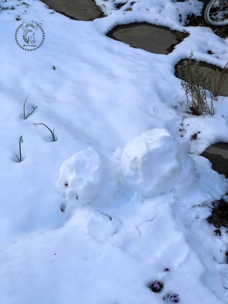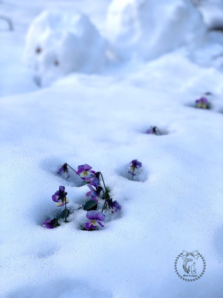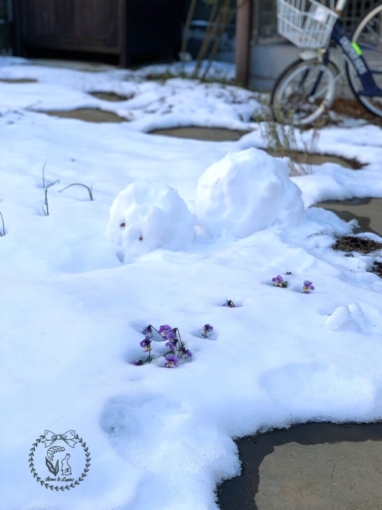 ミッ◯ィーの奥でツンツンしているのはタマネギです。倒れたミッ◯ィーをバックに、雪の中からビオラが顔を出している様子がなんとも美しかったです。