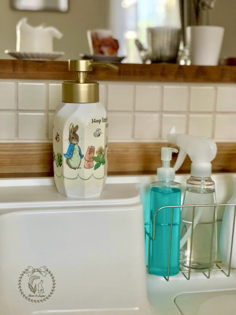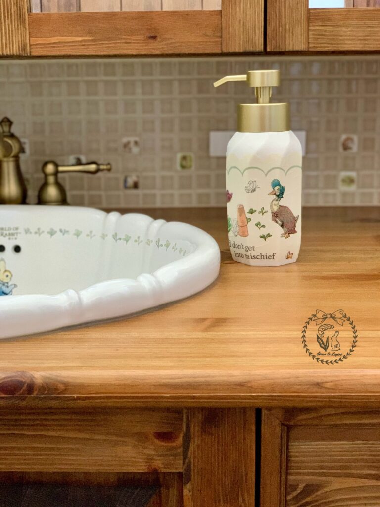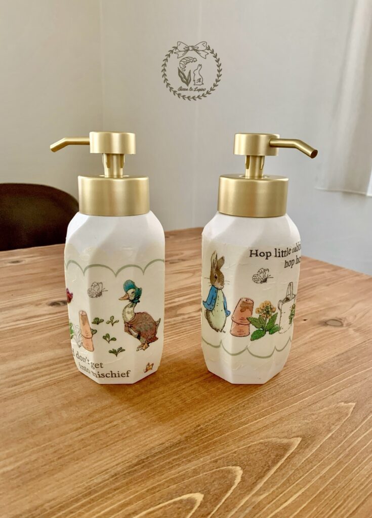 デコパージュのクオリティは低いですが、ピーターラビットのおかげで結果的に最高に可愛いです♡手を洗うたびにルンルンです♩