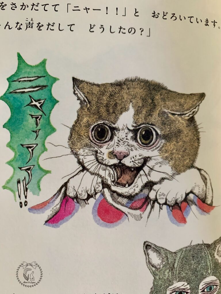 この、ニャァアア!!!に驚かされると共に笑ってしまいました。たまーにシュールで面白い絵があるのはわざとなのかなぁ?