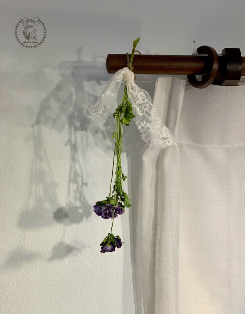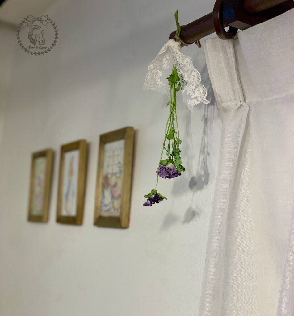 完成したドライフラワーは、レースを結びつけてカーテンレールに吊るしました♩