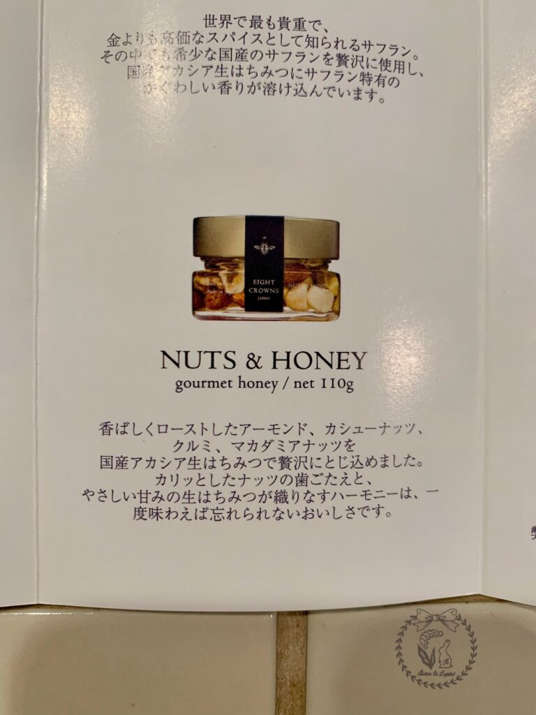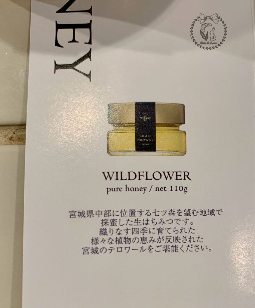 何も入ってないのは、WILDFLOWER というハチミツで、その名の通り、ハチさんが自然のお花の蜜を集めてできたハチミツだそうです。ハチさんにお任せなので、毎年味が変わるそうですよ(*’ω’*)!