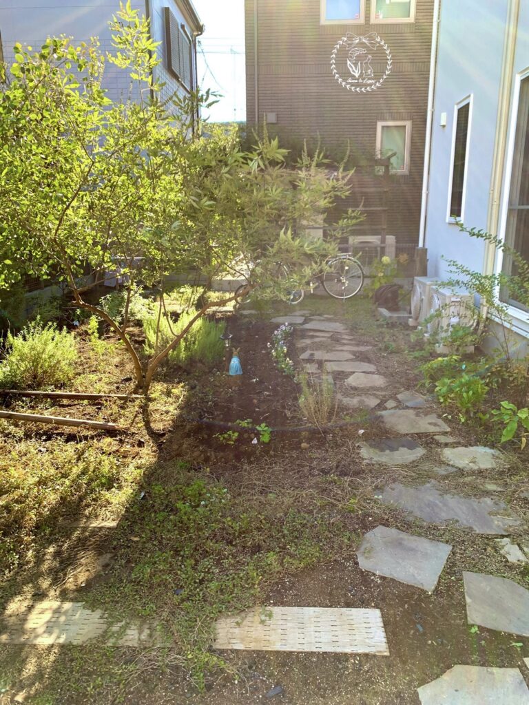 最低限の水やりを終えて庭を見渡すと、ちょうど朝日が庭に降り注ぎ、なんとも幻想的だったので思わず写真を撮りました。