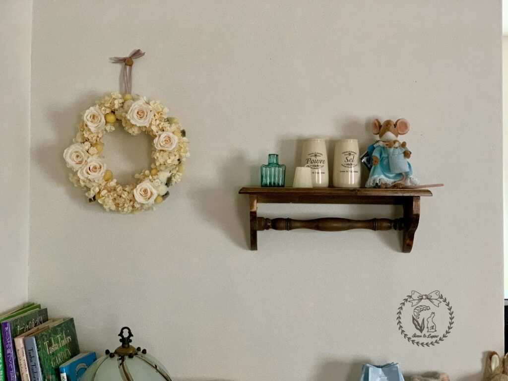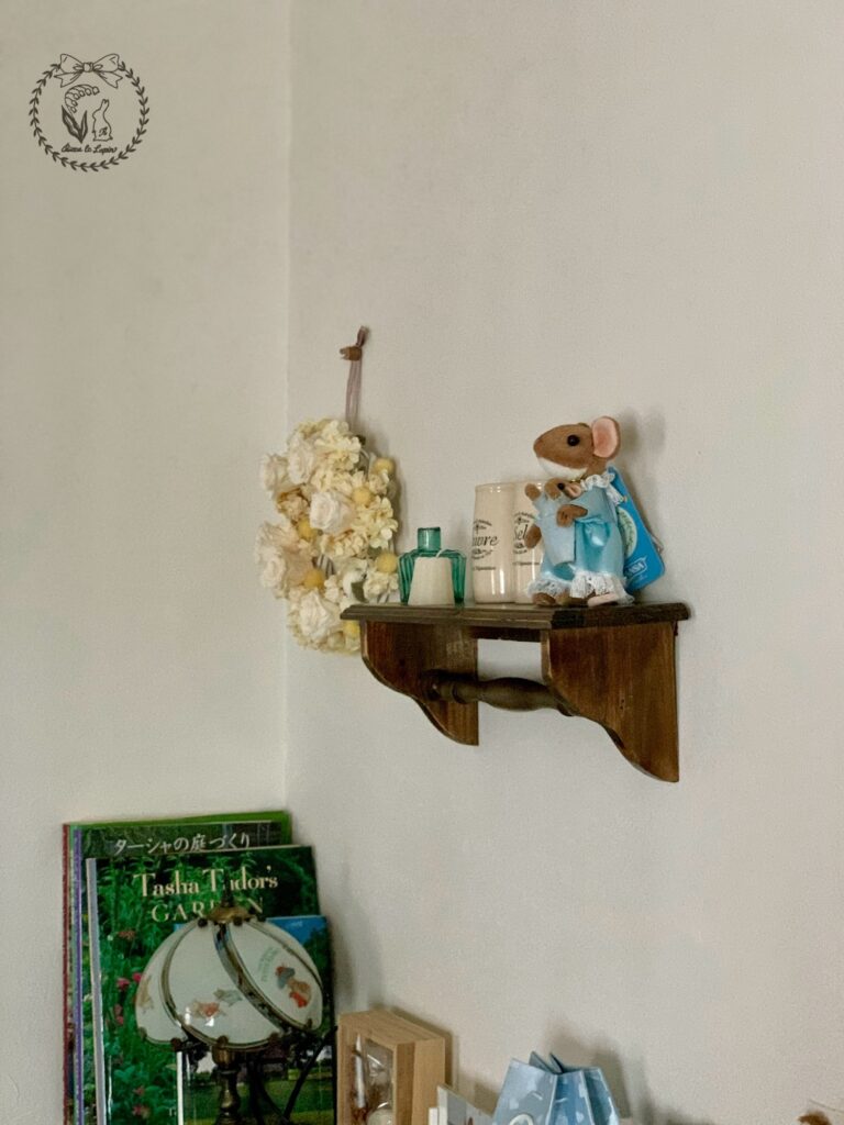 実は来週、数年ぶりに会う友人が初めてこの家に来てくれるので、午前中は気合を入れて掃除と整理整頓をしました。そして、買ったまま取り付けられずにいたウォールシェルフを、やっとこさ飾る事ができましたd( ̄  ̄)