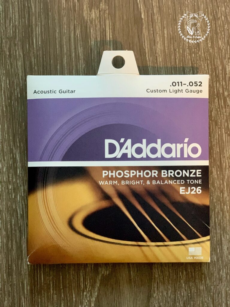これが、島村楽器の店員さんにオススメされた弦です。ライトゲージという標準の太さのものだそうです。これよりもう少し細くて女性でも扱いやすい弦もあるそうですが、音質が劣るそうで、私は頑張ってライトゲージを使っています٩( ‘ω’ )و