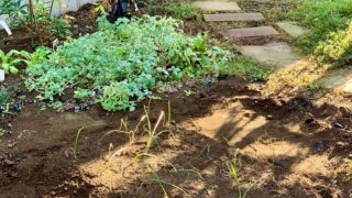 こんなに球根が芽吹いているので、そろそろ花壇のムスカリも頭を出しても良いころなのでは?と葉の間をかき分けて見ると…