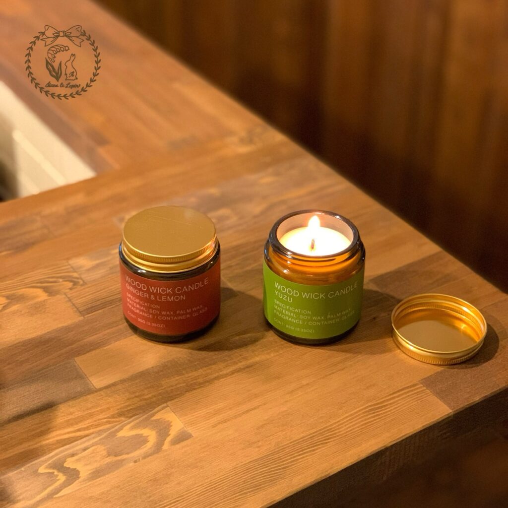 この瓶のキャンドルはこの2つしかなかったのですが、どちらも美味しそうな爽やかな柑橘の香りがします♩でも、火を灯すと本当に僅かにしか香りは広がらないので、個人的にはもっとムンムンに香ってくれればいいのに、と思ってしまいました。そこはプチプラだから仕方ないのかもです。香りが広がるのは、私が試したプチプラの物の中では、ニトリのアロマキャンドルが今のところ一位ですねぇ。